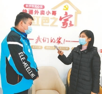 湖南分社記者王云娜(右)在湖南省長沙市天心區(qū)坡子街街道楚湘社區(qū)“快遞外賣小哥紅色之家”采訪。 李蔓蔓攝