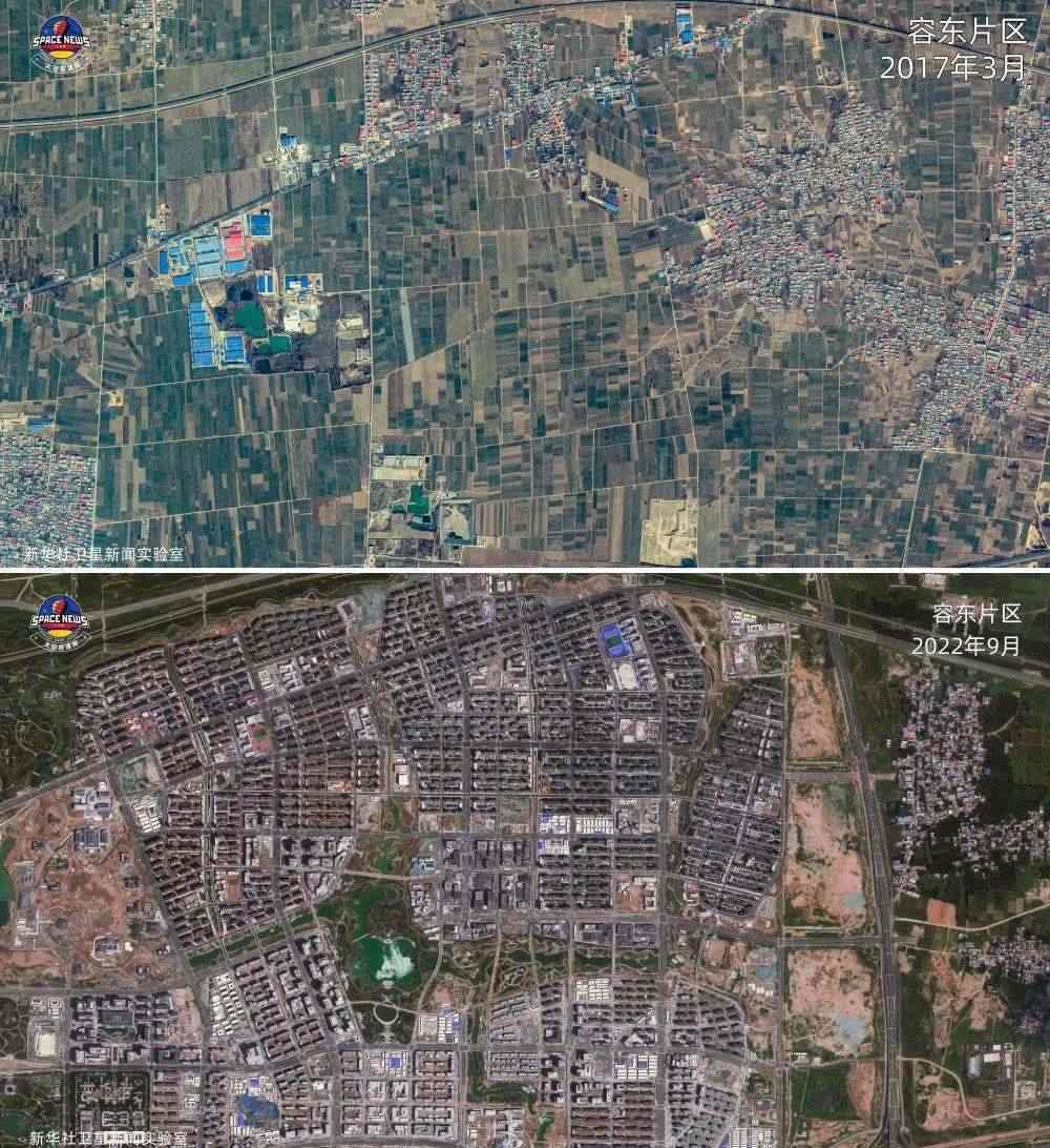 拼版照片:上圖為2017年3月的雄安新區(qū)容東片區(qū)衛(wèi)星圖;下圖為2022年9月的雄安新區(qū)容東片區(qū)衛(wèi)星圖。