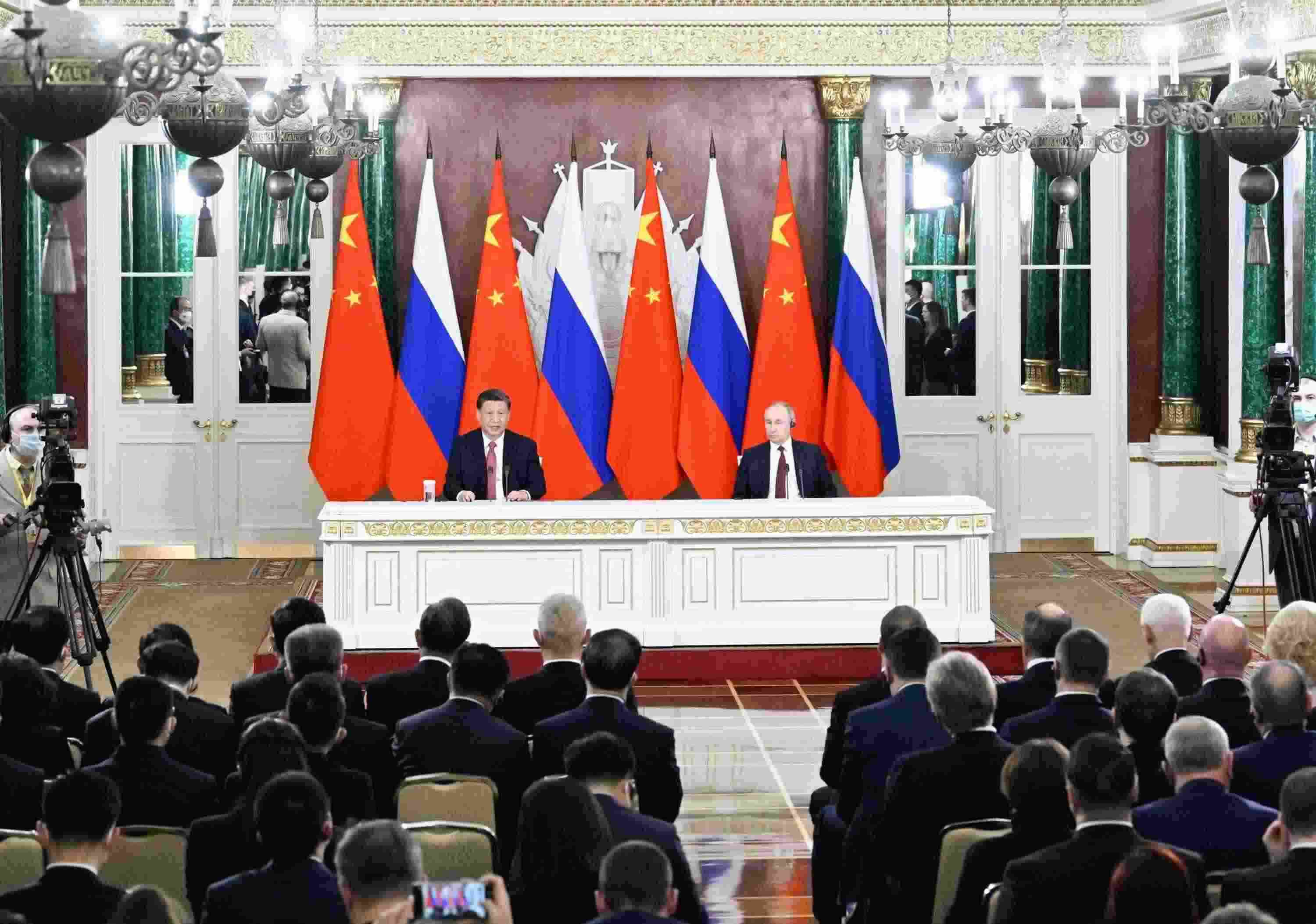 當(dāng)?shù)貢r(shí)間3月21日下午,國家主席習(xí)近平在莫斯科克里姆林宮同俄羅斯總統(tǒng)普京舉行會(huì)談。這是會(huì)談后,兩國元首共同會(huì)見記者。