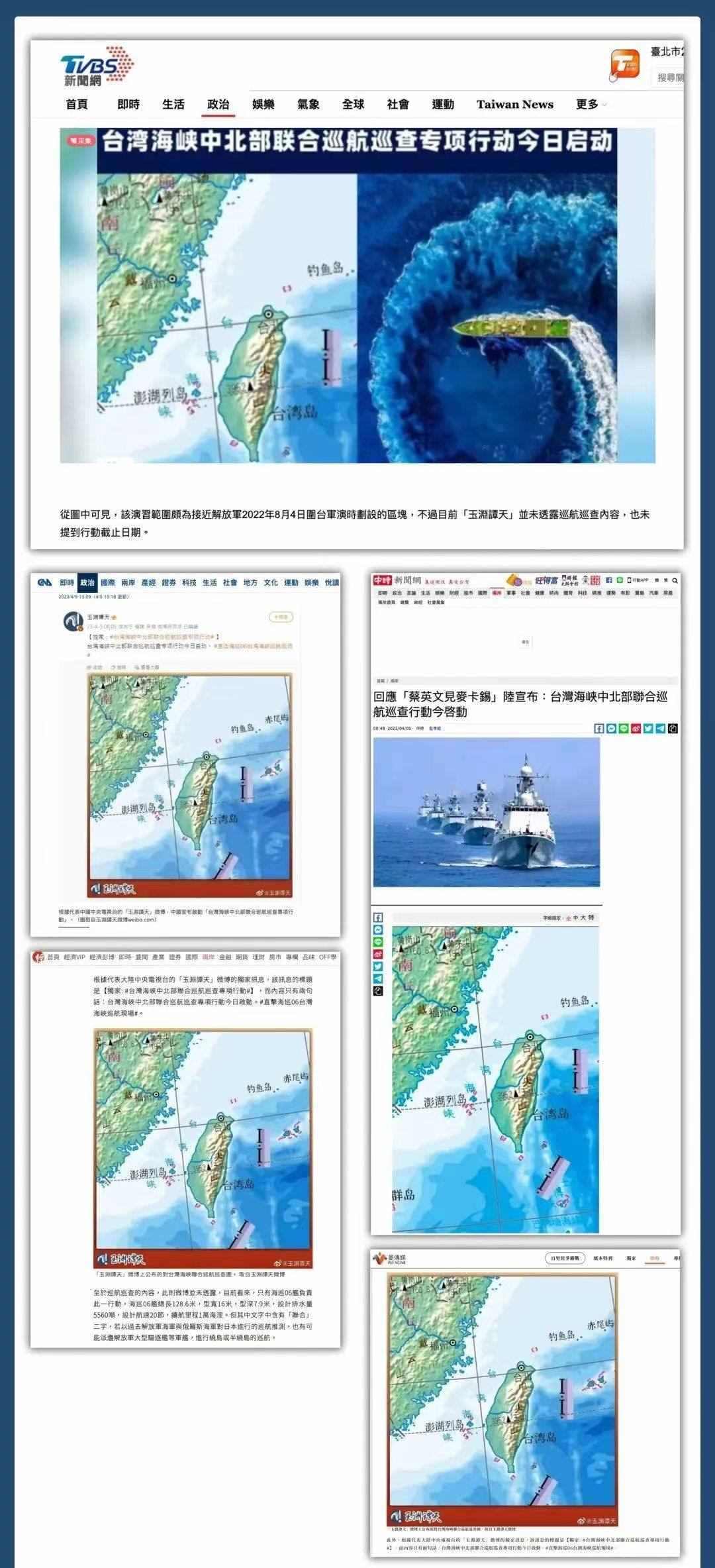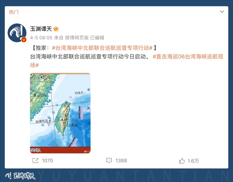 多家主流媒體轉(zhuǎn)發(fā)引用,消息瞬間傳遍全網(wǎng)。90余家臺灣媒體多平臺轉(zhuǎn)發(fā),揣測此次巡航活動及玉淵譚天配圖釋放的信號。臺當(dāng)局就此消息進行緊急回應(yīng),美國之音也撰文評論。