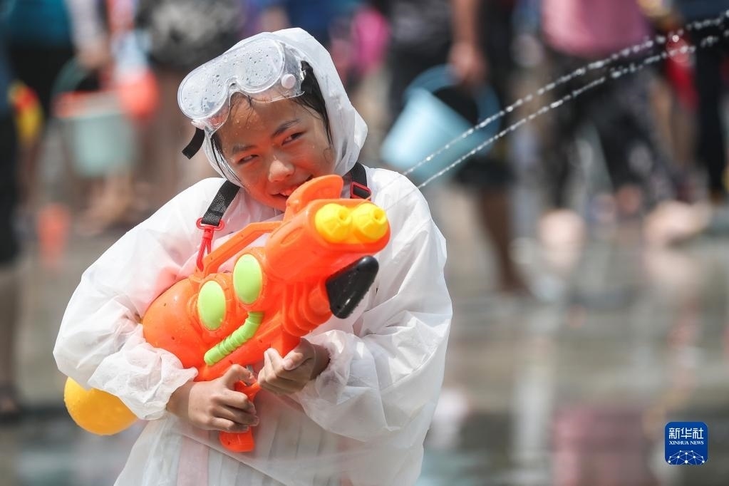 4月15日,人們在云南省西雙版納傣族自治州景洪市潑水廣場潑水狂歡。