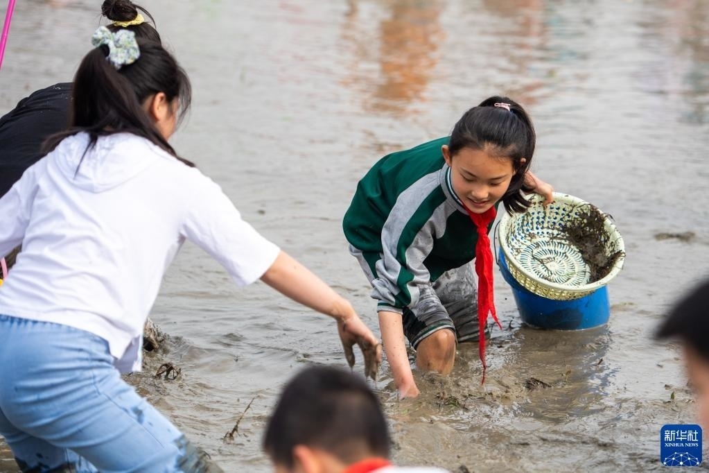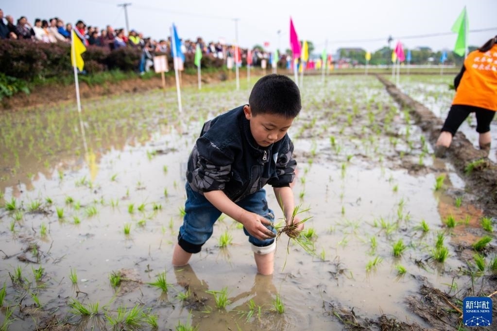當(dāng)日,在湖南省長(zhǎng)沙市寧鄉(xiāng)市灰湯鎮(zhèn)花果山村舉行的農(nóng)耕民俗文化節(jié)學(xué)生研學(xué)活動(dòng)中,孩子們通過(guò)開展稻田插秧、捉泥鰍等“農(nóng)趣” 比賽,走進(jìn)田間地頭,感受勞動(dòng)帶來(lái)的艱辛與快樂。新華社記者 陳思汗 攝