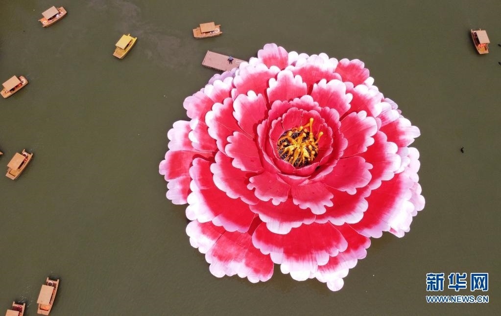 近日,在河南省洛陽(yáng)市隋唐城遺址植物園,一座直徑36米、高13米的巨型牡丹景觀造型亮相滴翠湖,吸引游客前來(lái)觀賞。   新華社發(fā)(黃政偉 攝)