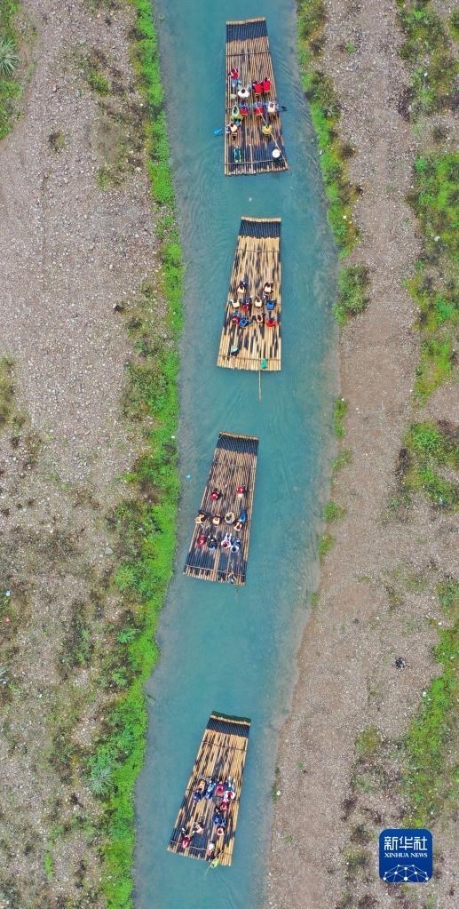 4月29日,游客在浙江省臺(tái)州市仙居縣永安溪體驗(yàn)生態(tài)竹筏漂流(無人機(jī)照片)。