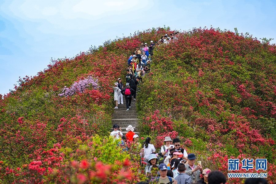 當(dāng)日,在貴州省黔東南苗族侗族自治州丹寨縣縣城邊海拔1400多米的龍泉山,萬(wàn)畝杜鵑花競(jìng)相綻放,山谷間、棧道旁、懸崖上,一顆顆、一簇簇、一朵朵杜鵑花迎風(fēng)搖曳,形成浩瀚花海,引來(lái)眾多游客登高望遠(yuǎn),飽覽靈山秀水之美。
