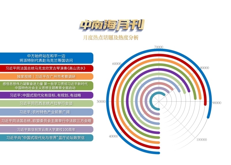 央視網(wǎng)“智聞”系統(tǒng)提取分析4月全網(wǎng)時政新聞熱點顯示,“中方始終站在和平一邊,將派特別代表赴烏克蘭等國訪問”“中法元首非正式會晤”“習(xí)近平在廣州市考察調(diào)研”等話題備受關(guān)注。