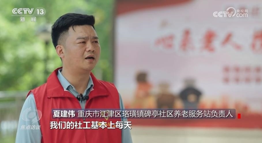 重慶市江津區(qū)珞璜鎮(zhèn)碑亭社區(qū)養(yǎng)老服務(wù)站負(fù)責(zé)人夏建偉:“一天下來,滿滿當(dāng)當(dāng)?shù)?,我們的社工基本上每天都超過了兩萬三千步的樣子。雖然說很累,但是每一個社工都很愉快,都覺得在這個過程當(dāng)中找到了快樂,也找到了成就感?!?/p>