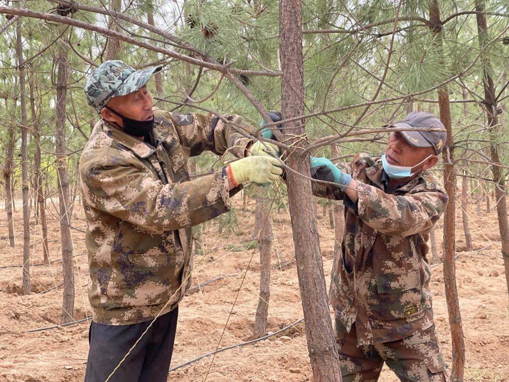 面龐黝黑的丁河勇在白芨灘工作了31年,治沙的情懷像樹苗一樣扎根在這片土地。“呵護(hù)這些樹苗就像呵護(hù)我的孩子一樣,修剪、澆灌、補植、病蟲害防治,絲毫馬虎不得。我已經(jīng)習(xí)慣了與樹為伴的生活,隔兩天不上山看看林子,心里就不踏實?!彼f。