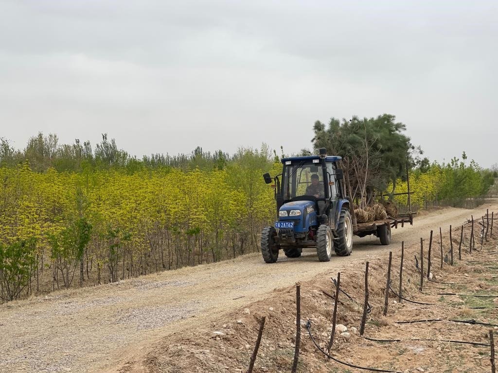 寧夏靈武白芨灘國家級自然保護(hù)區(qū)馬鞍山林場內(nèi),一輛拖拉機在運送樹苗。新華社記者蘇醒 攝