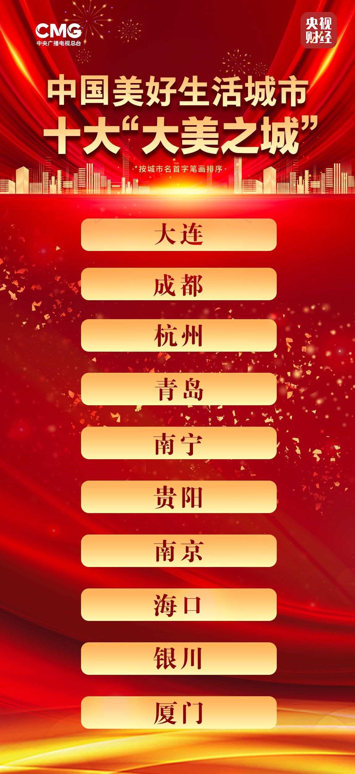 大連、成都、杭州、青島、南寧、貴陽、南京、???、銀川、廈門上榜十大“大美之城”(城市均以首字筆畫排序)。