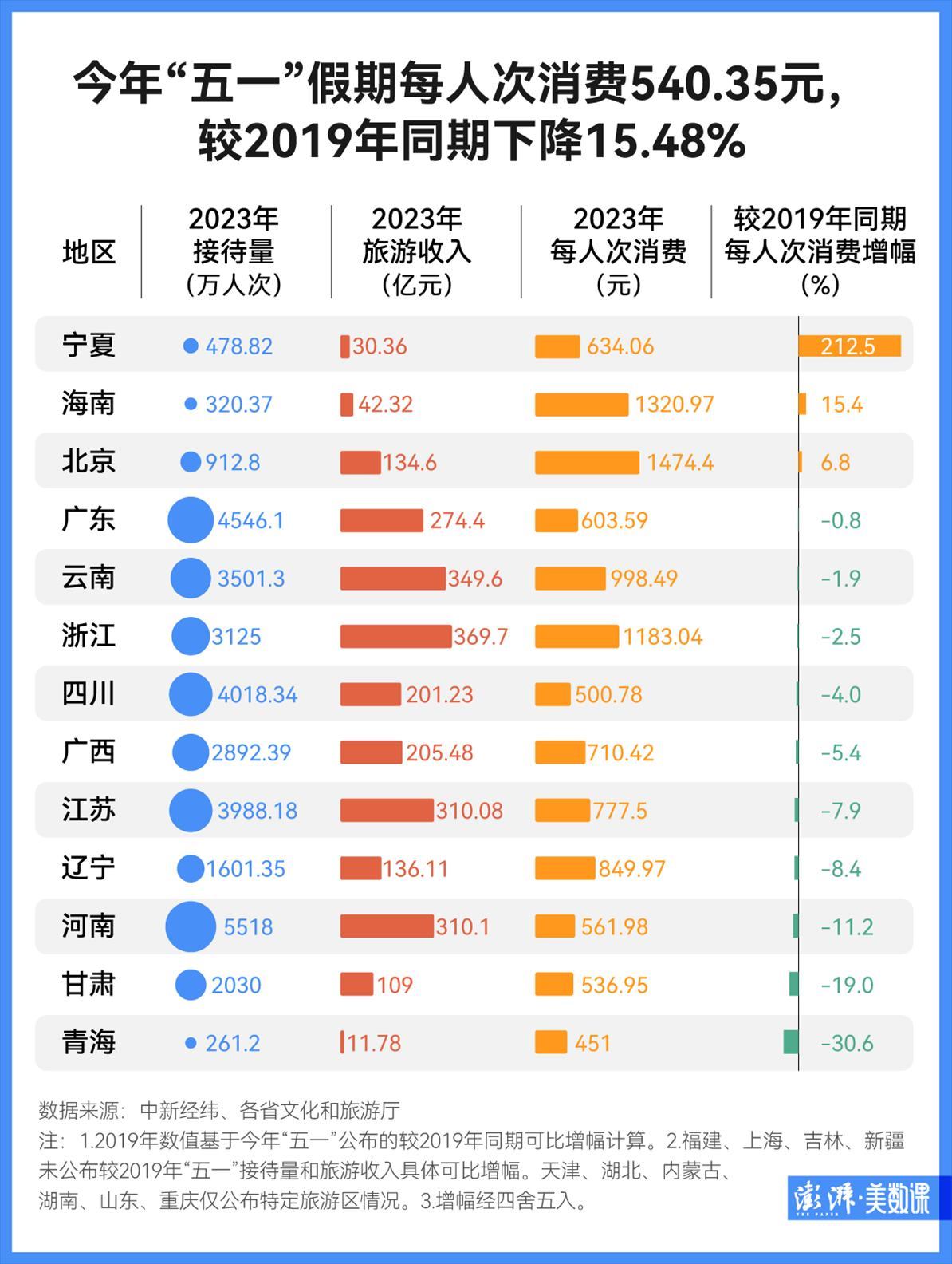 然而,人流井噴的背后,消費卻暫未回歸。以文旅部公布的數(shù)據(jù)進行計算,今年“五一”假期每人次消費540.35元,較2019年同期下降15.48%。澎湃新聞記者還統(tǒng)計了各省的“五一”消費成績單,發(fā)現(xiàn)大部分省市的每人次消費,較2019年同期皆有所下降。