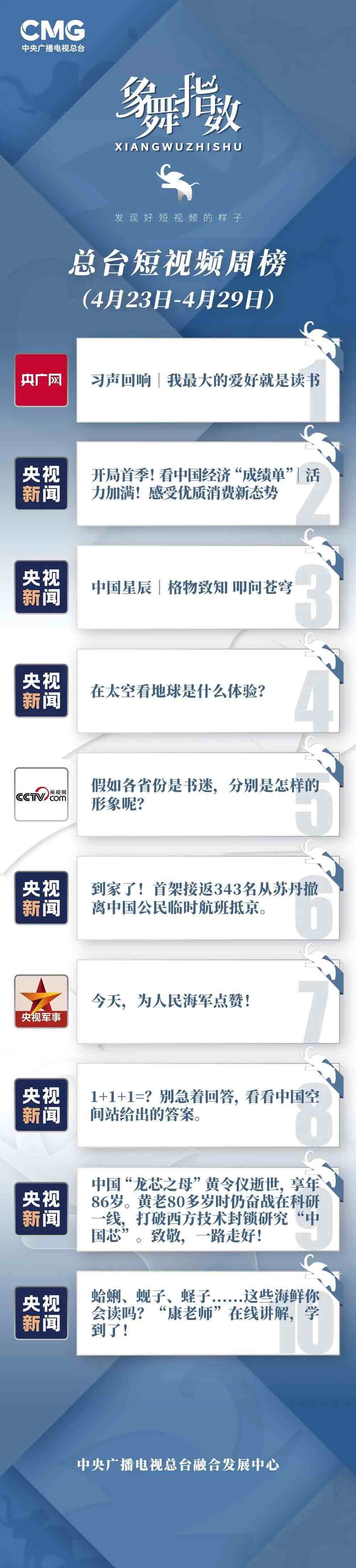 中央廣播電視總臺(tái)“象舞指數(shù)”評(píng)議品牌,推出主流媒體短視頻周榜、總臺(tái)短視頻周榜。在2023年4月23日—4月29日,這些內(nèi)容引發(fā)大眾關(guān)注:
