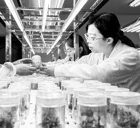 3月29日,在內(nèi)蒙古林業(yè)科學(xué)研究院承擔(dān)的“沙地生物資源保護(hù)與培育國家林業(yè)和草原局重點(diǎn)實(shí)驗(yàn)室”,科研人員在觀察黑果枸杞組培苗的培養(yǎng)狀態(tài)。丁根厚攝/光明圖片