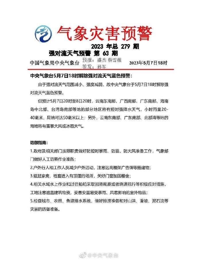 央視網(wǎng)消息:中央氣象臺5月7日18時解除暴雨藍色預警和強對流天氣藍色預警。