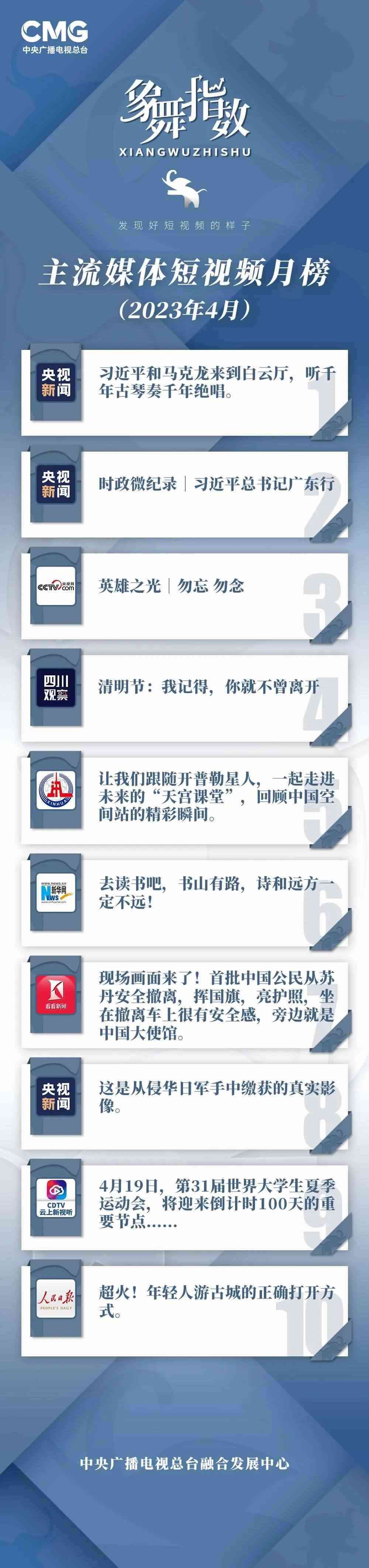 中央廣播電視總臺“象舞指數(shù)”評議品牌,推出主流媒體短視頻月榜、總臺短視頻月榜。在2023年4月,這些內(nèi)容引發(fā)大眾關注: