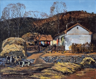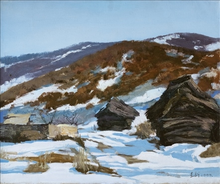 《激戰(zhàn)松骨峰》描繪的是抗美援朝戰(zhàn)爭中,中國人民志愿軍與美軍激烈廝殺的悲壯場面。作者從動(dòng)態(tài)型的構(gòu)圖與形象表層,把戰(zhàn)爭集團(tuán)之間的搏殺以濃重的筆調(diào)展現(xiàn)開來,表現(xiàn)了中國人民志愿軍英勇頑強(qiáng)、熱愛自由和勇于犧牲的精神,展示了歷史的悲劇性沖突。作者從沉甸甸的歷史中找到戰(zhàn)爭中最慘烈、最殘酷、最能表現(xiàn)人物悲劇性命運(yùn)的瞬間,用現(xiàn)實(shí)主義的創(chuàng)作手法,扎實(shí)、生動(dòng)地塑造了一個(gè)又一個(gè)志愿軍勇士的形象。硝煙籠罩著戰(zhàn)場,鮮血與白雪融合成冰,敵我雙方,犬牙交錯(cuò),生死搏殺。同時(shí),也使我們感受到戰(zhàn)爭的殘酷與生命的脆弱。作者處理宏大的戰(zhàn)爭場面獨(dú)具匠心:陽光透過硝煙,有節(jié)奏地營造出戰(zhàn)場的空間;雪地上被間隔的藍(lán)色陰影,反襯出黃褐色的主調(diào)。作品對細(xì)部進(jìn)行了恰如其分的刻畫,但又不失對整體宏觀的把握,厚重的色彩中透出熱情,樸拙的筆觸映著畫家的激動(dòng)。
