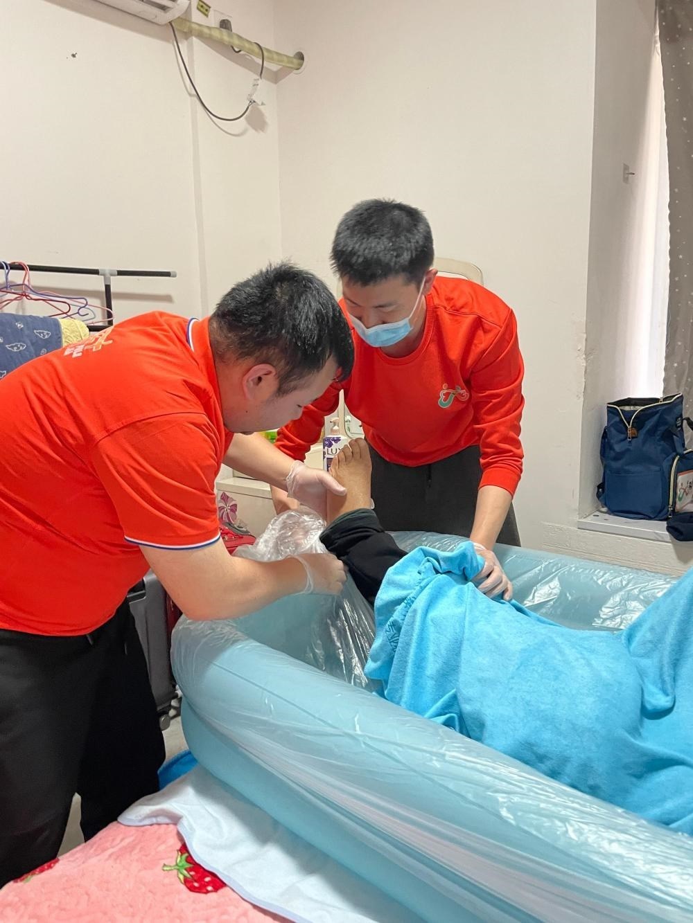 這樣的助浴服務(wù),晏楊俊祺已經(jīng)完成了200多次,每一次都是磨人的“大工程”。身為四川福樂家綜合養(yǎng)老服務(wù)有限責(zé)任公司的助浴師,上門服務(wù)前,他都要初步掌握老人病史、皮膚情況、血壓血糖、是否有自主活動能力等基本信息,據(jù)此做好各項準備,同時發(fā)給老人家屬一些有關(guān)助浴流程和內(nèi)容的視頻。服務(wù)時,對于失能老人,助浴師還需分工協(xié)作,通常一人主要負責(zé)洗澡,一人負責(zé)陪老人說話并觀察身體狀態(tài),還有一人負責(zé)換水、幫忙抬抱老人等,整個服務(wù)過程大約1個小時。