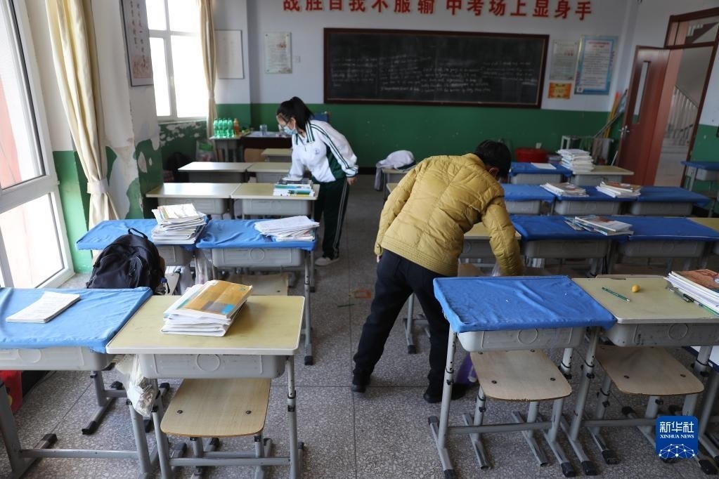 張連琴(左下)和女兒李昕偉在教室內(nèi)聽課(5月8日攝)。