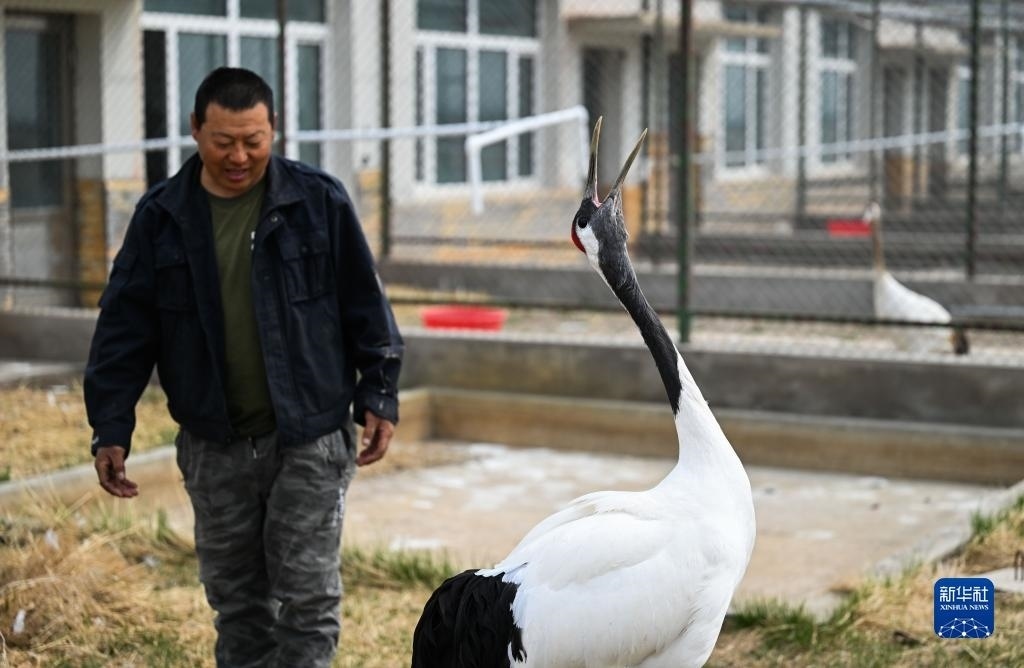 5月11日,徐沃德樂胡在觀察救助的丹頂鶴進(jìn)食。