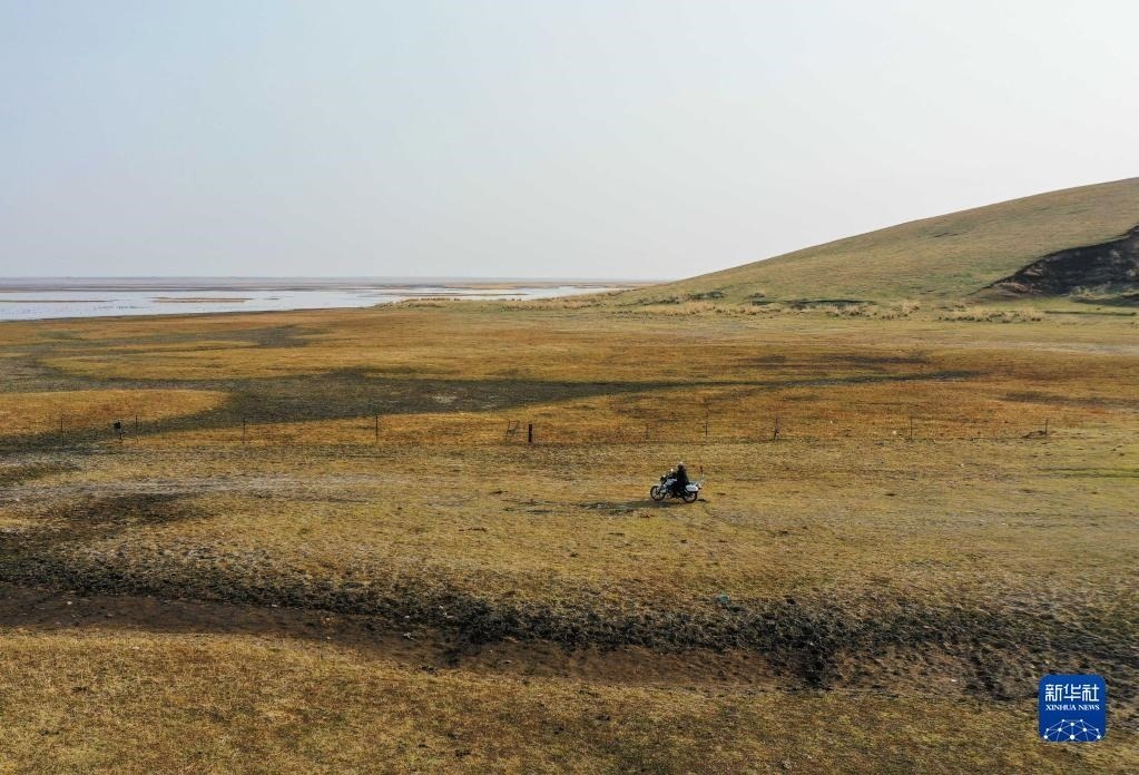 5月10日,徐沃德樂胡騎著摩托在管護(hù)站附近巡護(hù)(無人機照片)。