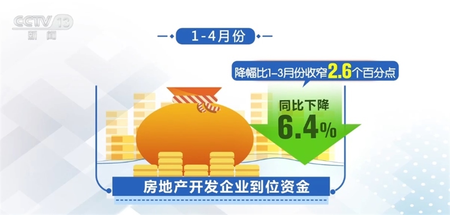 從房企資金看,受到市場(chǎng)銷售改善影響,房地產(chǎn)開發(fā)企業(yè)資金緊張狀況有所緩解,1—4月份,房地產(chǎn)開發(fā)企業(yè)到位資金同比下降6.4%,降幅比1—3月份收窄2.6個(gè)百分點(diǎn)。