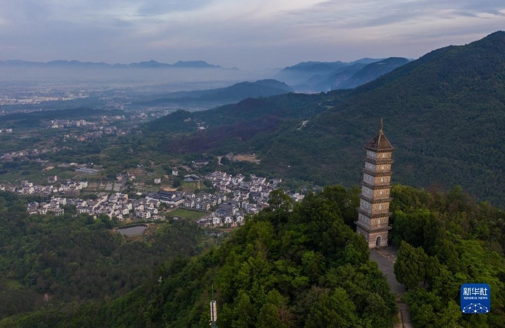 俯瞰天臺(tái)縣的赤城山及山頂?shù)牧哄?月16日攝,無(wú)人機(jī)照片)。