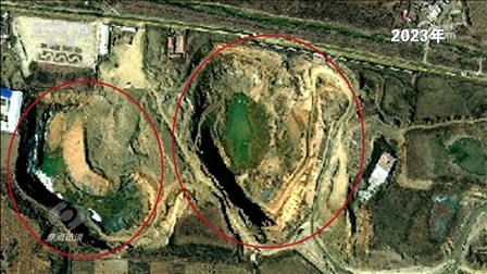 這兩個大坑真的如這位負責人所說變化不大嗎?記者查閱了從2018年至今的衛(wèi)星圖片,上面清晰顯示:2018年,北面大坑上面原來有廠房,還有道路,南面是一個尾礦庫。2019年,地塊南北同時出現新挖的坑,之后這兩個坑不斷擴大。到了2020年,北面的廠房已經不見了,南面的坑也在變大。2021年、2022年,兩個大坑都在變大變深,逐漸靠攏,到了2023年,最終形成了現在的樣子。