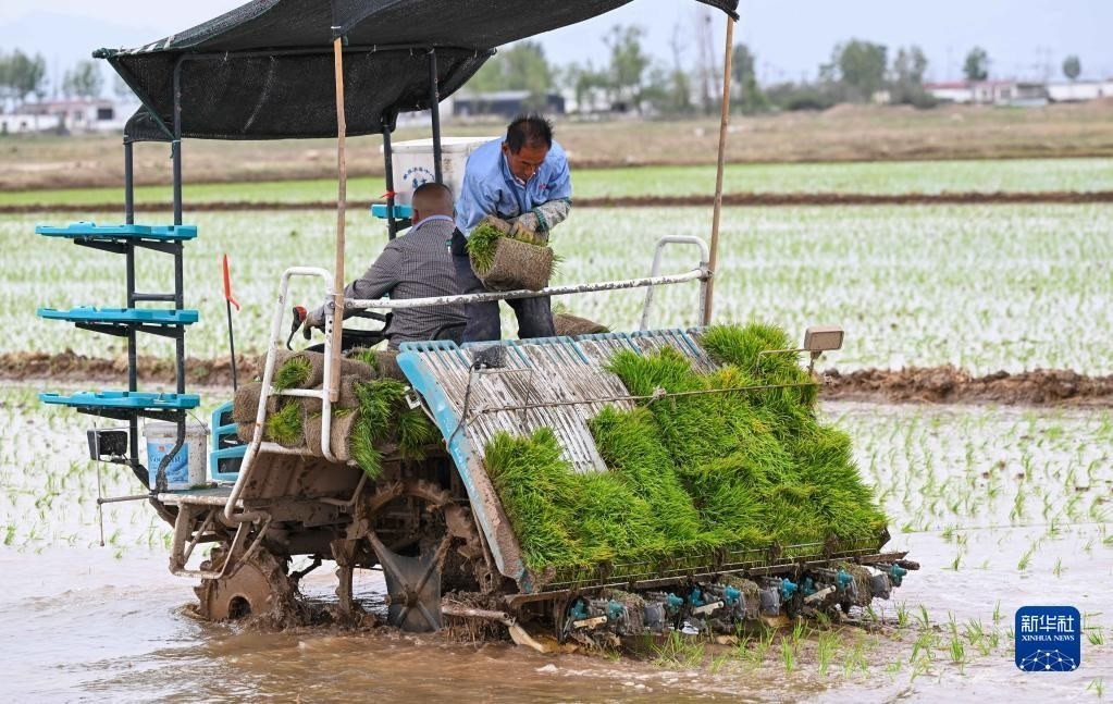 5月23日,達拉特旗昭君鎮(zhèn)村民在鹽堿地改良水稻田中使用農機插秧。