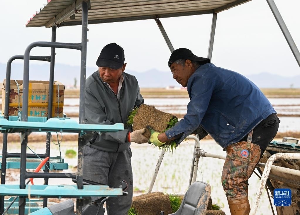 5月23日,達拉特旗昭君鎮(zhèn)村民在為農機添加秧苗。
