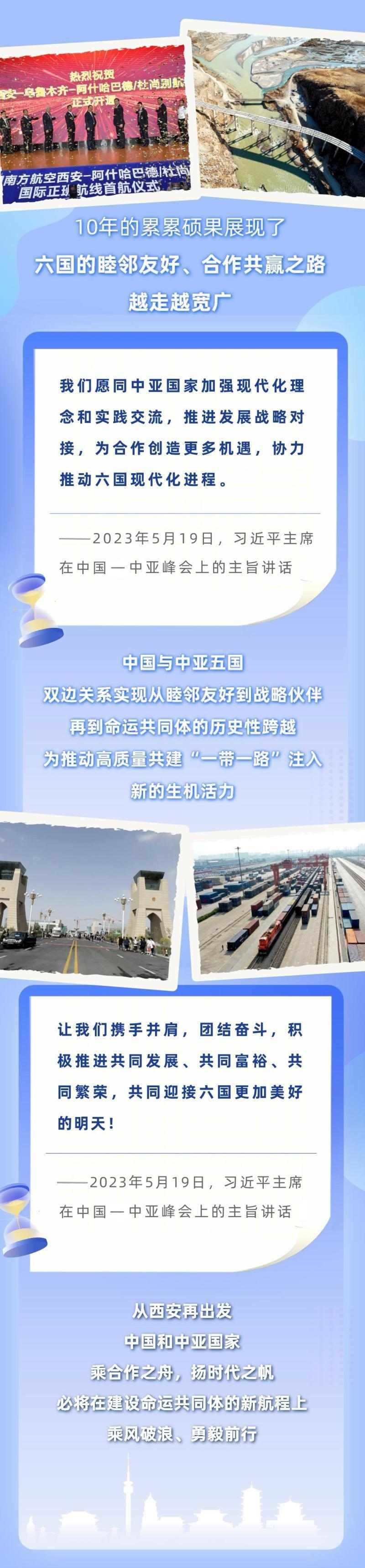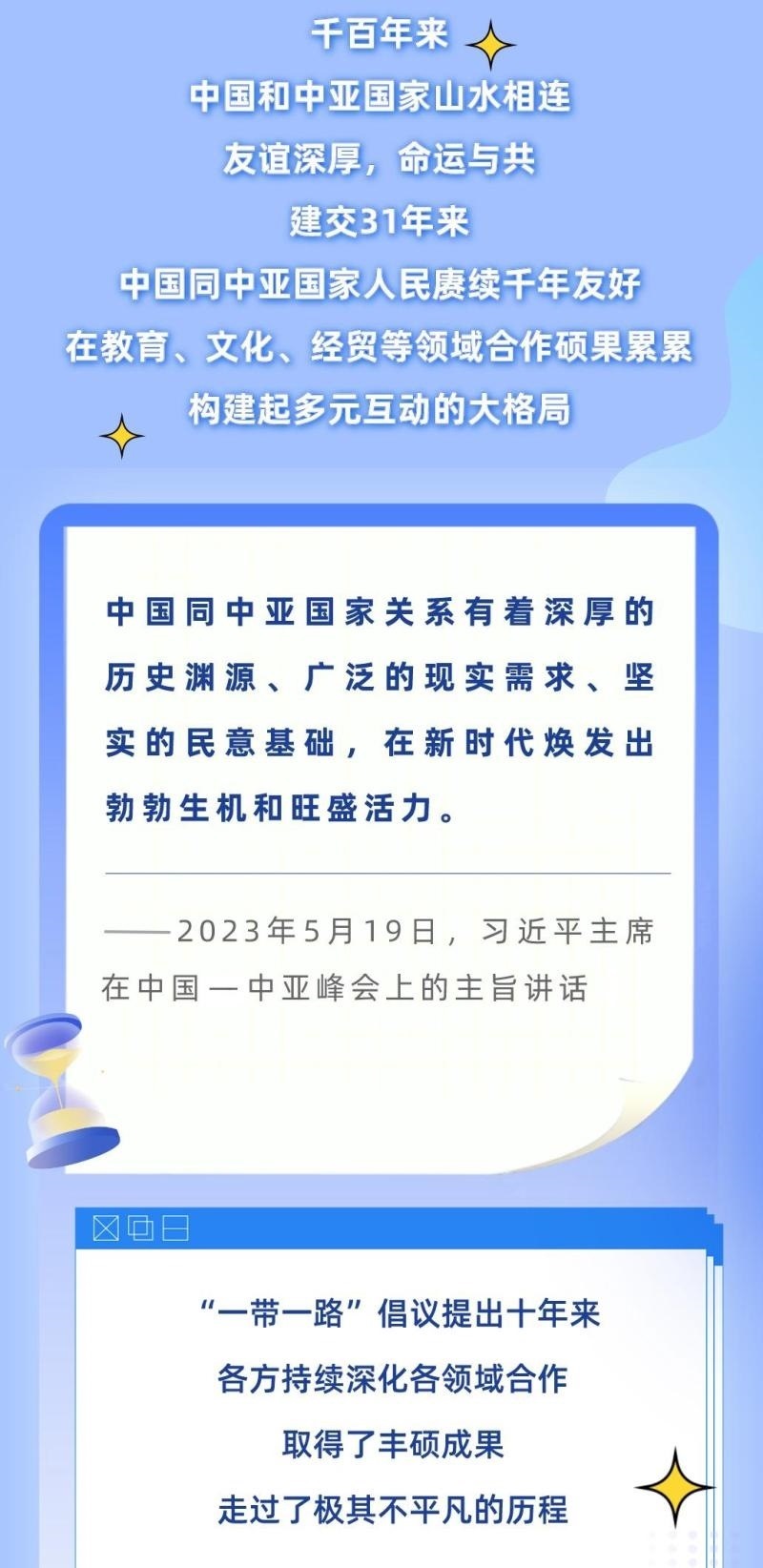 從去年1月的建交30周年視頻峰會,到今年這次中國—中亞峰會,習近平主席同中亞五國元首連續(xù)兩年集體會晤,并正式成立中國—中亞元首會晤機制,為中國—中亞關(guān)系發(fā)展作出戰(zhàn)略領航。下面,讓我們一起通過習近平主席的重要講話,回顧中國與中亞國家源遠流長的友誼、極其不凡的合作歷程,讀懂中國—中亞峰會的重要意義。
