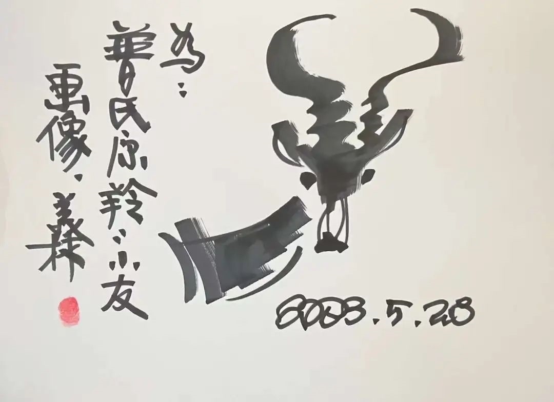 ▲韓美林為原青海省第十二屆人大常委會黨組副書記,現(xiàn)三江源生態(tài)保護基金會理事長鄧本太簽書留念