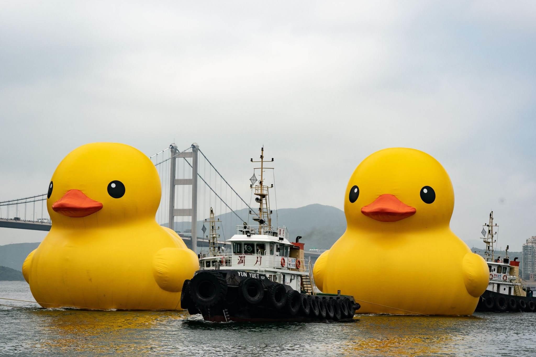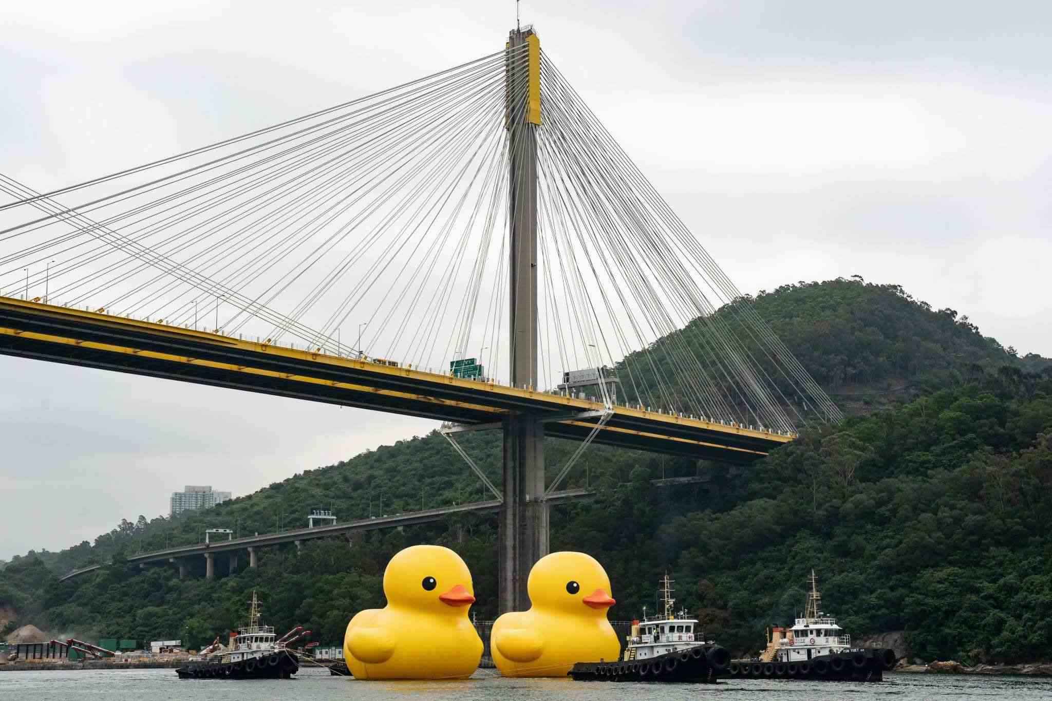 2023年5月25日,香港,兩只18米高的巨型橡皮鴨現(xiàn)身于青衣海域,引市民關注。視覺中國