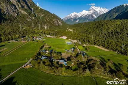 2023年5月24日,西藏林芝,波密縣松宗鎮(zhèn)龍亞村,民居、樹(shù)木和遠(yuǎn)處的雪山相映成趣。