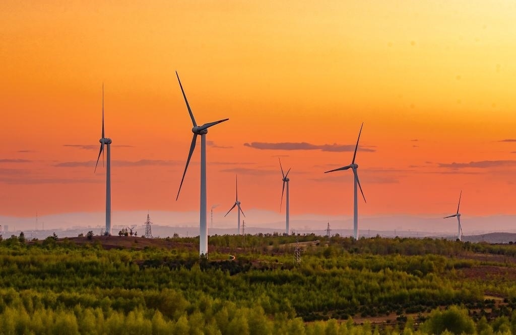 5月23日清晨拍攝的興安盟烏蘭浩特市呼和馬場(chǎng)風(fēng)力光伏發(fā)電場(chǎng)內(nèi)的風(fēng)機(jī)。新華社發(fā)(王正攝)