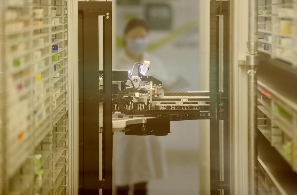 4月2日,浙江省德清縣第三人民醫(yī)院智慧藥房發(fā)藥機(jī)器人在配藥。新華社發(fā)(謝尚國(guó)攝)