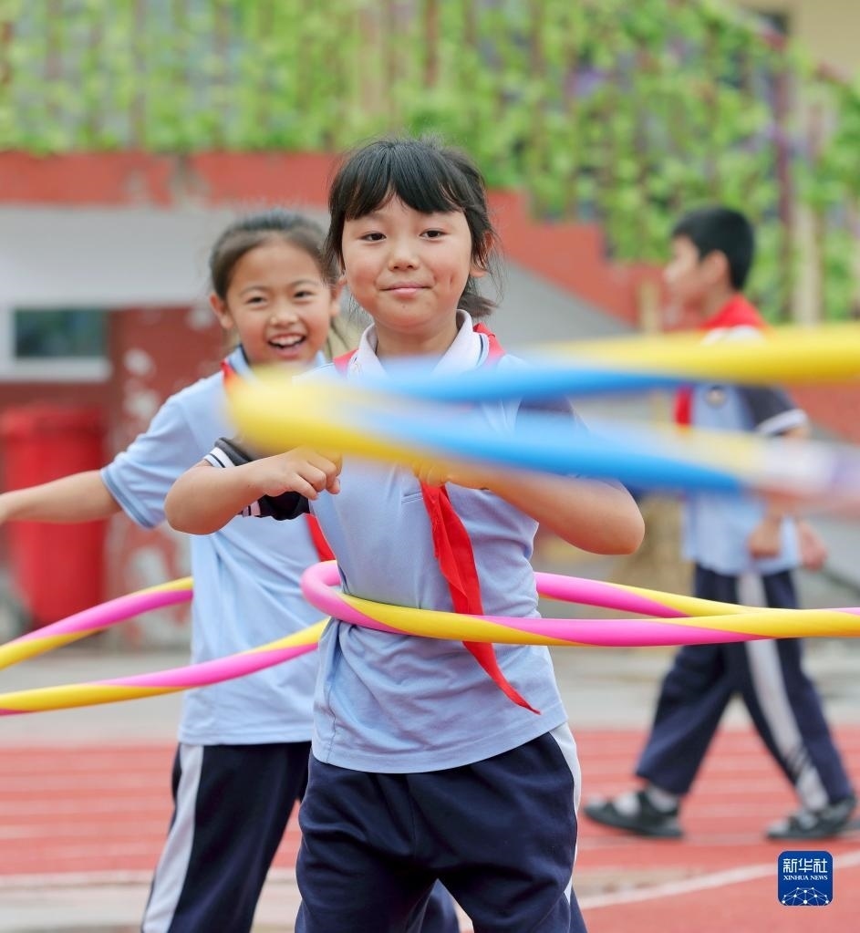 5月30日,河北省邢臺市廣宗縣第六小學學生在參加呼啦圈游戲。 新華社發(fā)(王壘攝)