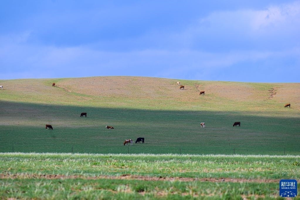 5月30日,牛群在內(nèi)蒙古錫林郭勒盟蘇尼特右旗境內(nèi)的草原上悠閑覓食。