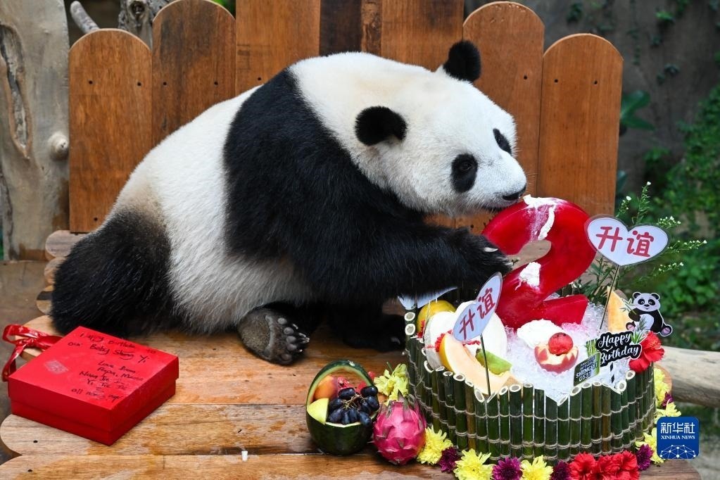 5月31日,在馬來西亞吉隆坡附近的馬來西亞國家動物園,大熊貓寶寶“升誼”享用生日大餐。
