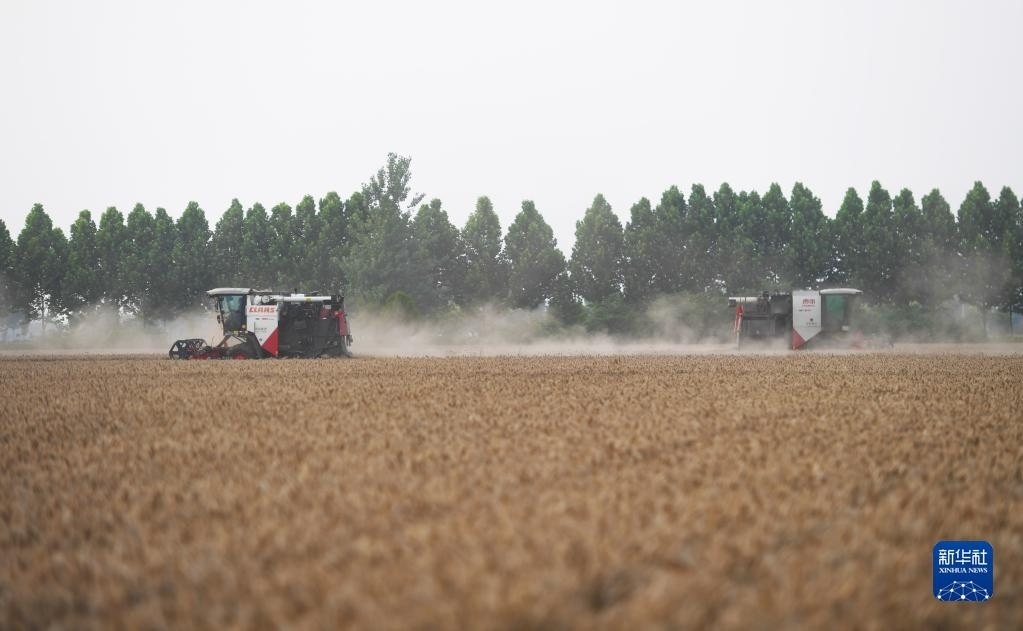 6月1日,在河南省駐馬店市上蔡縣邵店鎮(zhèn)劉岳村,收割機(jī)在搶收小麥。新華社記者 張浩然 攝