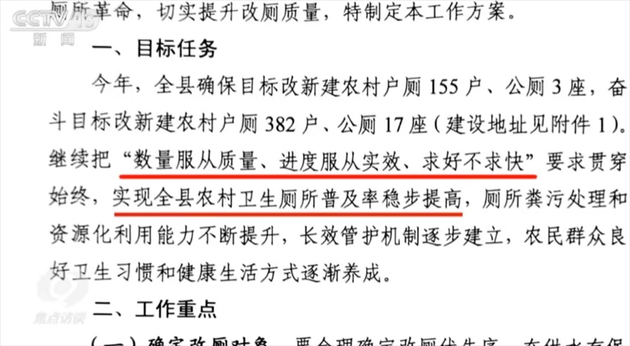 央視網(wǎng)消息(焦點(diǎn)訪談):“小廁所、大民生”。廁所問題不僅關(guān)系農(nóng)村人居環(huán)境的改善,也關(guān)系廣大人民群眾生活品質(zhì)的提升。目前,全國農(nóng)村衛(wèi)生廁所普及率超過73%,“廁所革命”走向縱深。然而,記者在調(diào)查中發(fā)現(xiàn),有些地區(qū)的廁改成績很“亮眼”,廁改成效卻很“扎眼”,這關(guān)乎百姓切身利益的大事兒,要經(jīng)得起“回頭看”、再檢驗(yàn)。