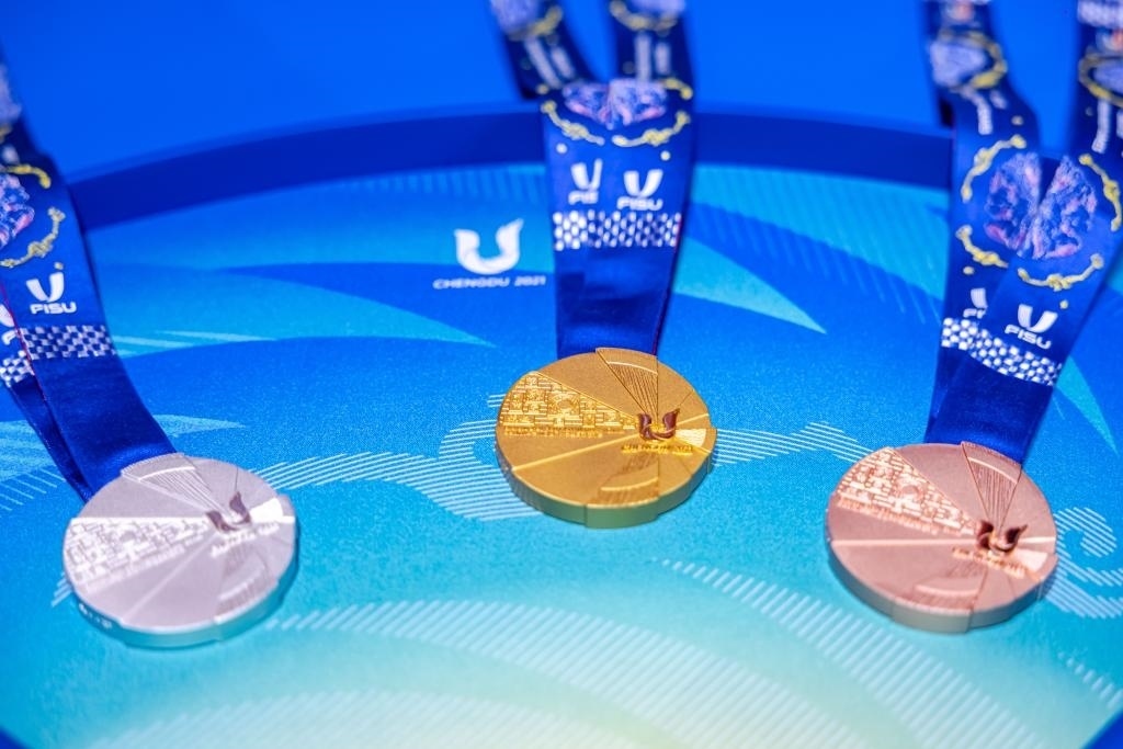 獎牌是每個體育賽事的重要組成部分之一,本屆大運會獎牌根據(jù)國際大體聯(lián)要求,融合成都和國際化傳播元素,最終形成了大運會獎牌“蓉光”。獎牌整體設(shè)計以成都大運會會徽和太陽神鳥為主要靈感,利用幾何扇面代表太陽光芒,傳遞了太陽神鳥守護夢想的設(shè)計概念。獎牌以“蓉光”為名,諧音為“榮光”,寓意榮耀、光彩,寄托了對大運健兒在成都青春展翅、乘夢而行的美好期許。