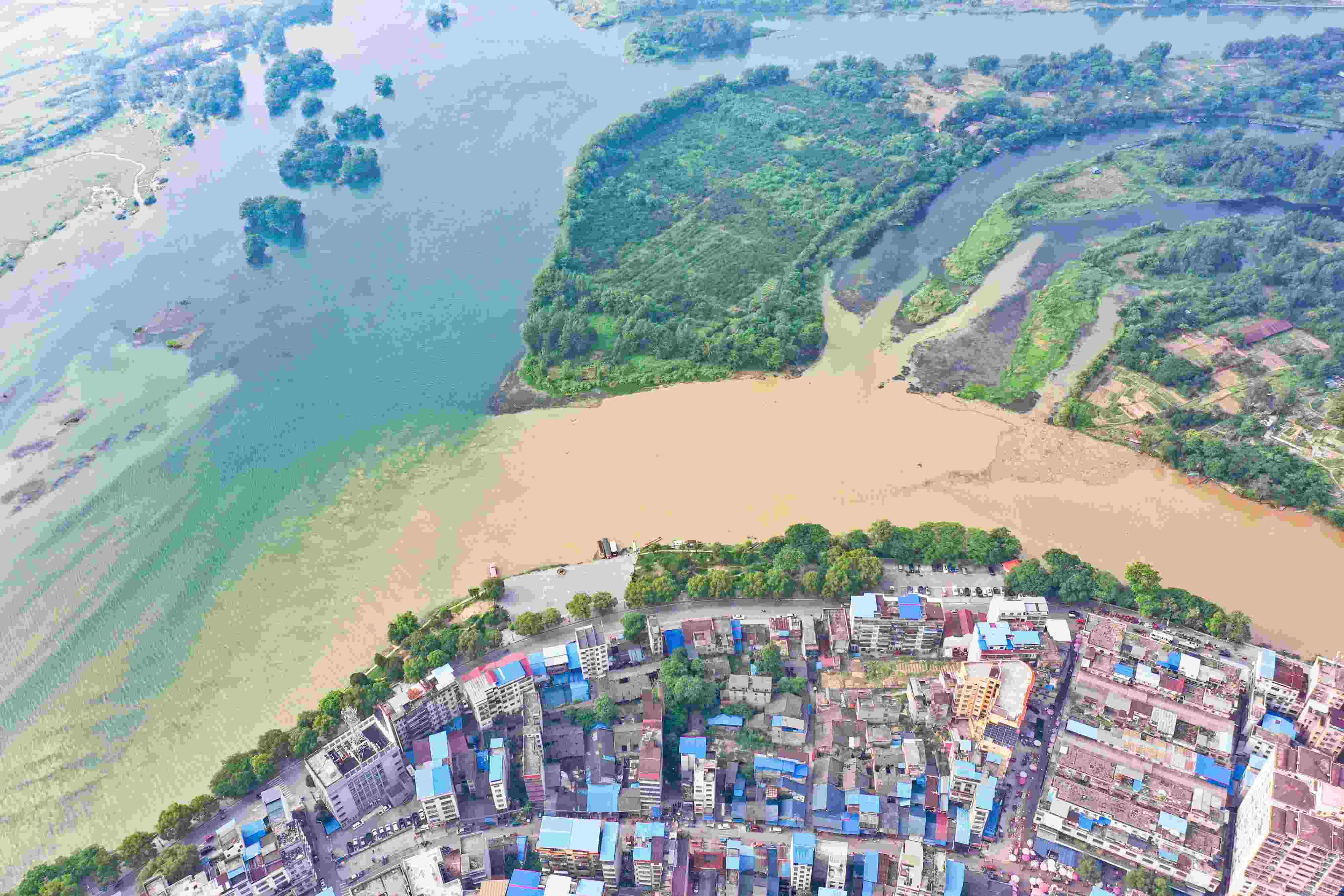 2023年6月4日,受降雨影響,廣西桂林全州縣城湘江河段出現(xiàn)涇渭分明景觀??罩懈╊?,湘江支流萬(wàn)鄉(xiāng)河混濁的河水繞城匯入清澈的湘江干流,交匯之處涇渭分明。 視覺(jué)中國(guó)