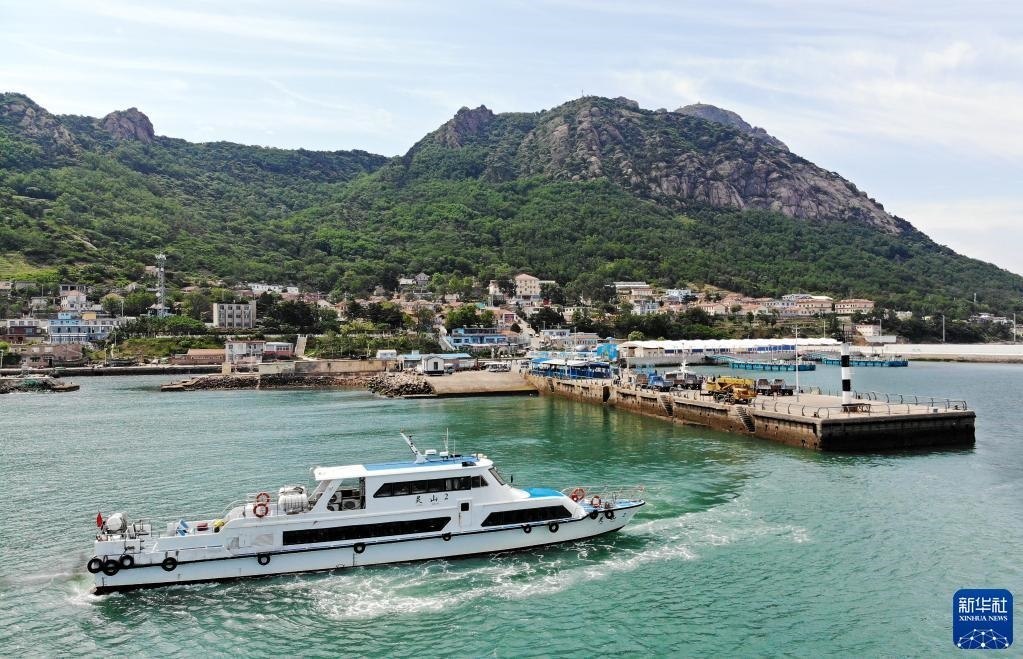 一艘快艇在靈山島省級(jí)自然保護(hù)區(qū)碼頭接送游客(6月5日攝,無(wú)人機(jī)照片)。