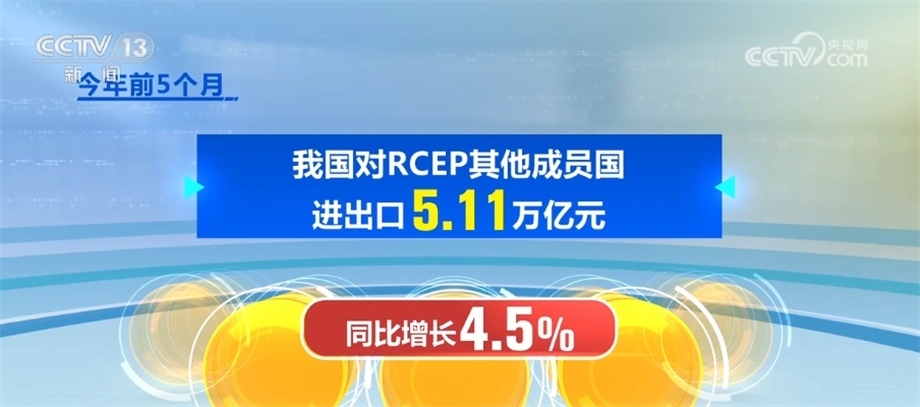 隨著區(qū)域經(jīng)濟(jì)交往不斷互聯(lián)互通,我國(guó)對(duì)《區(qū)域全面經(jīng)濟(jì)伙伴關(guān)系協(xié)定》(RCEP)其他成員進(jìn)出口穩(wěn)定增長(zhǎng),今年前5個(gè)月,我國(guó)對(duì)RCEP其他成員國(guó)進(jìn)出口5.11萬(wàn)億元,同比增長(zhǎng)4.5%,RCEP占我國(guó)外貿(mào)比重超過(guò)30%。