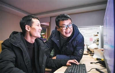 國(guó)家天文臺(tái)阿里觀測(cè)站駐站工程師尤顯龍(左)和同事唐鵬在討論觀測(cè)到的數(shù)據(jù)。新華社記者 晉美多吉攝
