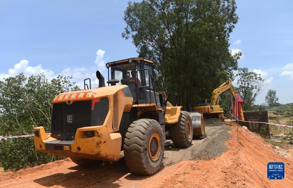 6月11日,在廣西合浦縣白沙鎮(zhèn),工人在施工修復遭洪水損毀的堤壩。