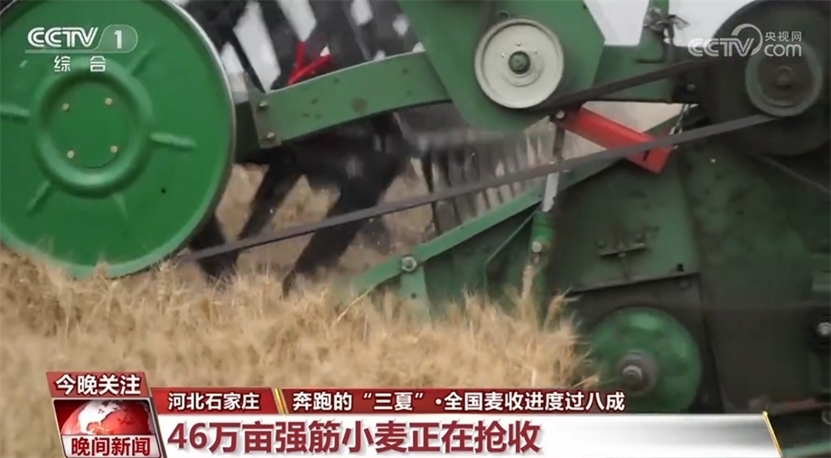 河北省石家莊市藁城區(qū)的46萬畝強(qiáng)筋小麥正在搶收,今年這里的小麥進(jìn)一步推行規(guī)?;N植、標(biāo)準(zhǔn)化生產(chǎn)、專業(yè)化收儲(chǔ)。