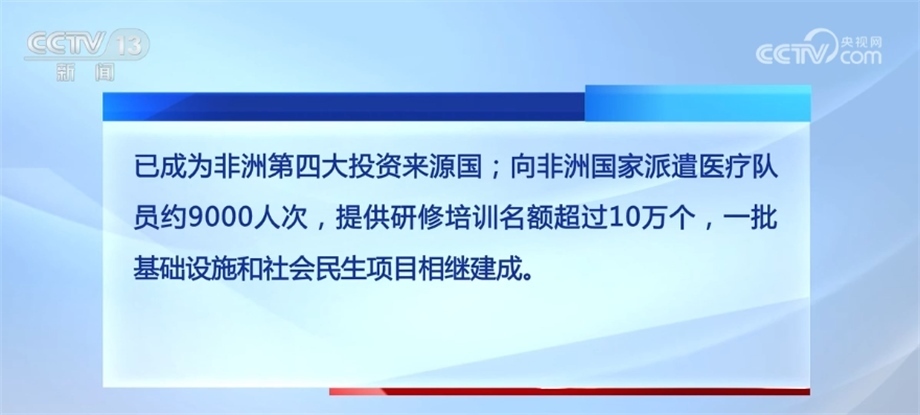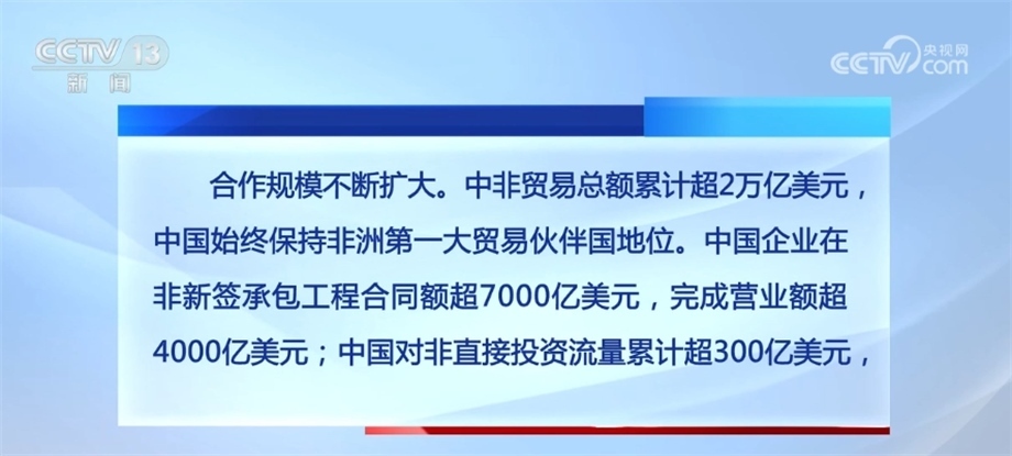 合作規(guī)模不斷擴(kuò)大。中非貿(mào)易總額累計(jì)超2萬億美元,中國(guó)始終保持非洲第一大貿(mào)易伙伴國(guó)地位。中國(guó)企業(yè)在非新簽承包工程合同額超7000億美元,完成營(yíng)業(yè)額超4000億美元;中國(guó)對(duì)非直接投資流量累計(jì)超300億美元,已成為非洲第四大投資來源國(guó);向非洲國(guó)家派遣醫(yī)療隊(duì)員約9000人次,提供研修培訓(xùn)名額超過10萬個(gè),一批基礎(chǔ)設(shè)施和社會(huì)民生項(xiàng)目相繼建成。