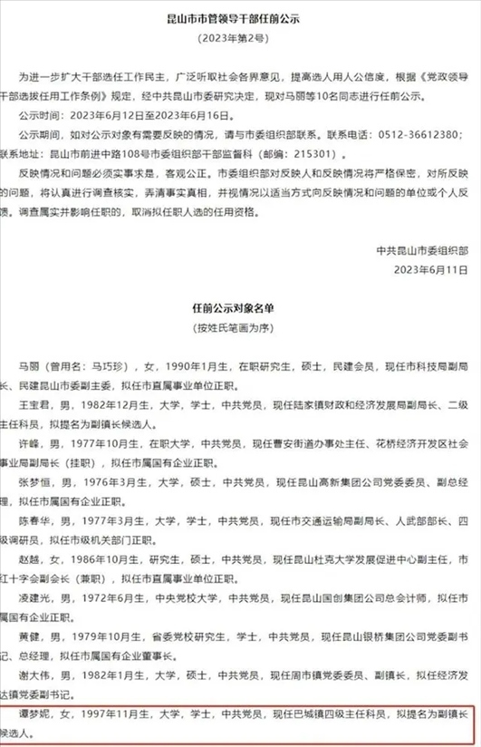 ·中共昆山市委組織部干部監(jiān)督科回應(yīng)97年出生女子擬提名副鎮(zhèn)長:是按正常流程進行,有問題可以監(jiān)督舉報。