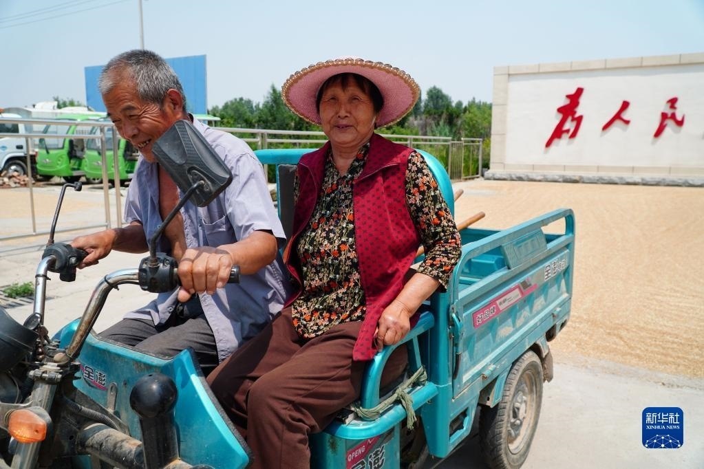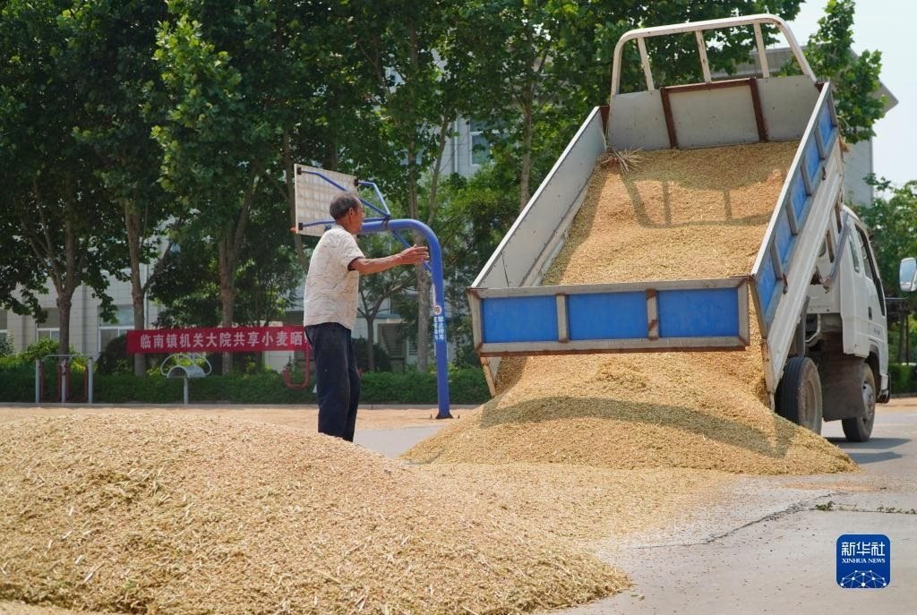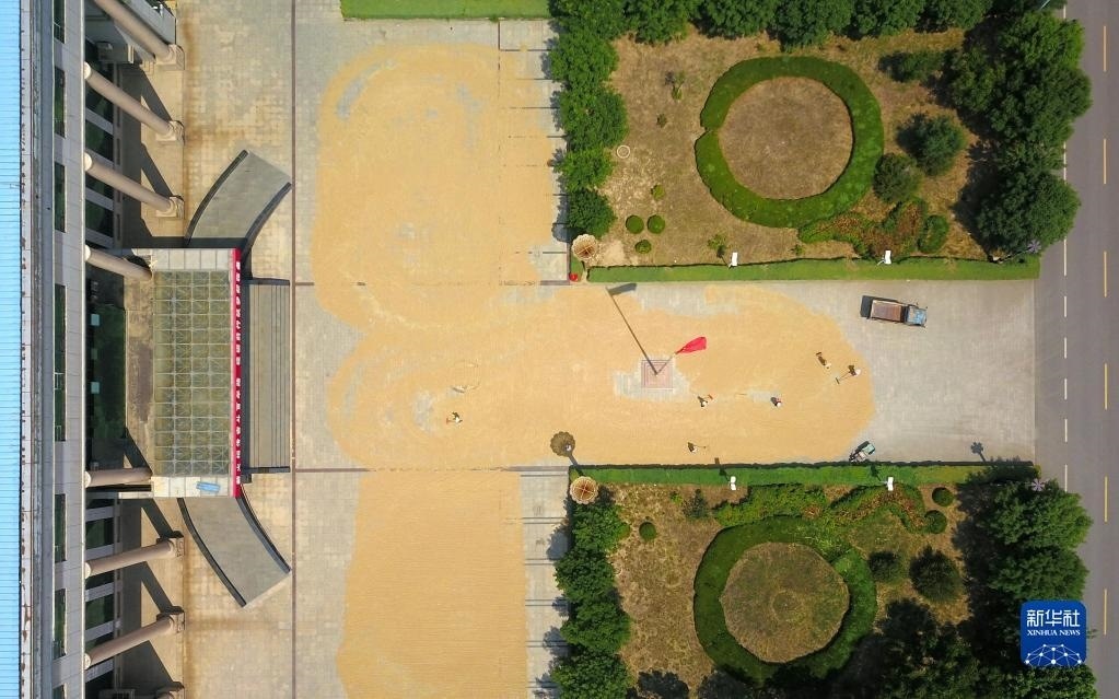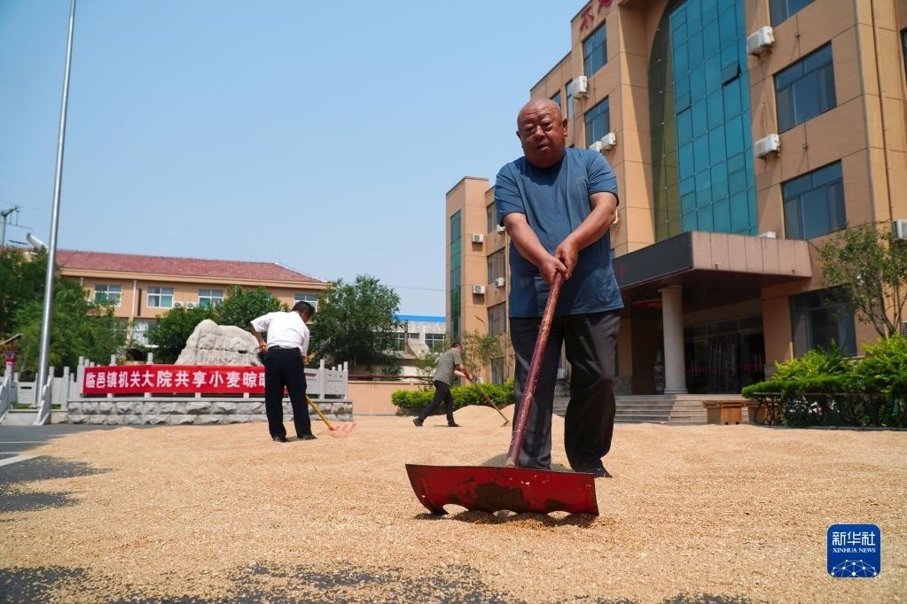 6月13日,農戶在臨邑縣臨盤街道政府大院曬糧。